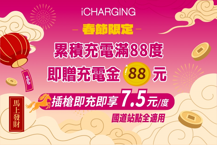 • 春節優惠及充電金適用於全台 iCharging 充電站,但 合作充電場站不適用。